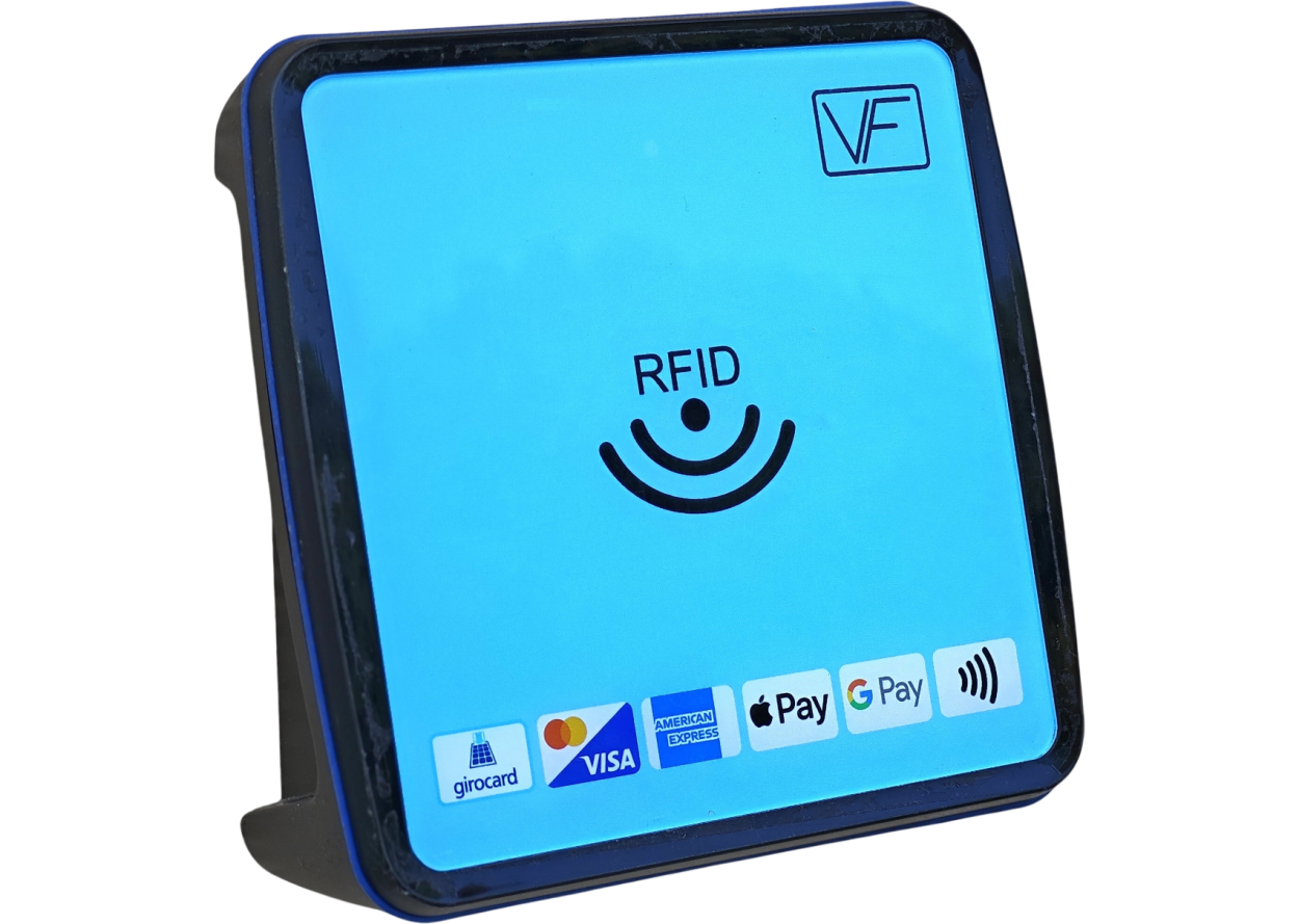 The universal access control system VF VeriFlexx is suitable for 24/7 access control with EC, VISA, Mastercard, American Express and RFID cards. Reading virtual cards (Google Pay and Apple Pay) as well as customer cards (13.56 MHz, various Mifare versions) is also possible. Using the remote controller box with integrated power supply the system can me managed. With the associated software, all functions of the system can be configured, read and saved externally.